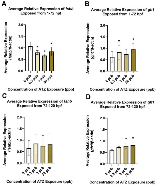 4.5. Gene Expression Analysis for Embryonic (1–72 hpf) or Larval (72–120 hpf) Atrazine Exposures
