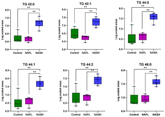 | TG 46:2 | TG 10:0_18:1_18:1 TG 12:0_16:0_18:2 TG 12:0_16:1_18:1 TG 14:0_14:0_18:2 TG 14:0_14:1_18:1 TG 14:0_16:1_16:1 TG 14:1_16:0_16:1 | 7.10 × 10−3 | 2.80 × 10−3 | 1.8 | 3.28 | 3.20 × 10−2 | 2.1 | 3.41 | 3.12 |