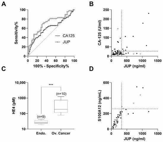 Diagnosis performance of JUP in endometriosis. (A) ROC analysis for serum JUP (vertical lines, AUC (Area Under the Curve) 0.6048, p-value = 0.0154) and serum CA125 (clear circles, AUC 0.7054, p-value = 0.0006). JUP AUC vs. CA125 AUC (p-value = 0.1476). (B) Positive correlation of JUP with CA125 in serum; Pearson’s r = 0.551; p-value 1.020 × 10−8; n = 93 (CTL: clear circles; endometriosis: black circles). (C) Box and Whiskers plots of HE4 (Human Epididymis Protein 4) quantified in serum in patients with high CA125 (>26.8 U/mL) and high JUP (>324 ng/mL). HE4 was higher in patients with ovarian cancer (median = 189.0 pM) than in patients with endometriosis (median = 26.7 pM) (p-value < 0.0001, Mann-Whitney test). (D) Positive correlation of JUP with S100A12 in serum; Pearson’s r = 0.835; p-value = 2.180 × 10−16; n = 59 (CTL: clear circles; endometriosis: black circles). (*** = p-value < 0.001).