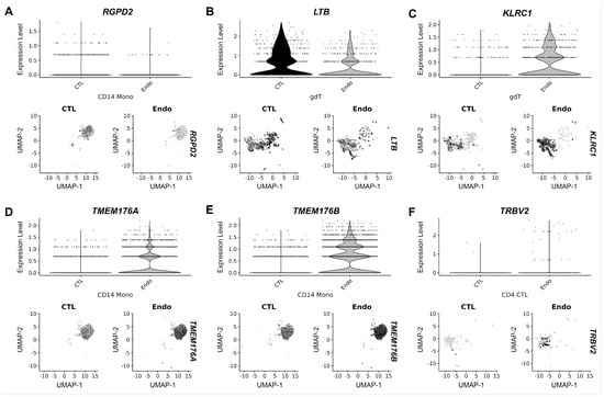 Expression profile of endometriosis DEGs in patients with high (A–C) and low (D–F) serum JUP. The upper panels represent the expression level of the DEGs in each identified cluster; (A) RGPD2 in CD14+ monocytes; (B) LTB in γδt; (C) KLRC1 in γδt; (D) TMEM176A in CD14+ monocytes; (E) TMEM176B in CD14+ monocytes; and (F) TRBV2 in CD4 CTLs. The lower panels represent the UMAP of each identified cluster in samples of women without endometriosis (left) and with endometriosis (right). A color code indicates the expression level of the DEGs in each cell; cells with higher expression levels are indicated by darker dots. KLRC1: Killer cell lectin-like receptor C1, LTB: lymphotoxin beta, RGPD2: RANBP2-like and GRIP domain-containing 2, TMEM176A and B: Transmembrane proteins 176A and B, TRBV2: T Cell Receptor Beta Variable 2.