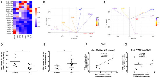Associations between gene expression levels of PPARG, AHR, and macrophage inflammatory markers in a GEO IBD dataset. RNA-seq data from an IBD dataset deposited at GEO was screened for transcriptional activation of PPARG, AHR, CD80, CD86, TNFA, IL6, and IL10 genes among healthy controls and UC patients. After being normalized to a 0–1 scale (range represented in the scalebar), values were displayed in a heatmap following a numerical order of subjects (A). PCA analyses were carried out individually for both the healthy control and UC groups. PC1 and PC2 represent principal components 1 and 2, respectively. The scale bar represents cos2 values, which indicate the color of the eigenvectors denoting how well they are represented by the variance model (B,C). TPM values (transcripts per million) for each of the parameters assessed were individually plotted, averaged, and compared between healthy controls and UC patients. Results are shown as mean ± standard deviation of the mean and were analyzed via Student’s t test. * p ≤ 0.05, ** p ≤ 0.01 in comparison between groups (D,E). Correlation tests between AHR and PPARG utilizing TPM values for both healthy control and UC patient groups were performed and individual positions of every correlation pair alongside the exact value for Pearson’s r correlation coefficient, r2, and p value, are shown (F,G). For all analyses, a total n = 8 for healthy controls and n = 10 for UC patients were utilized.