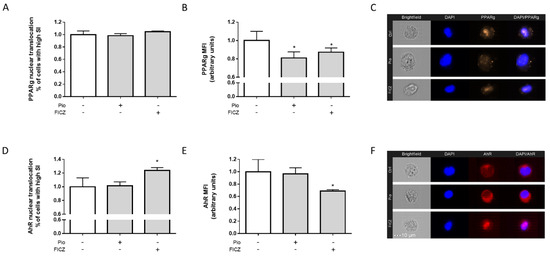 Effects of agonists on nuclear translocation and protein expression of AhR and PPARγ in THP-1 cells. Macrophage-differentiated THP-1 cells were treated with 10 µM of each pioglitazone (Pio) and FICZ for 24 h. Cells were harvested, fixed, and stained after treatments. Nuclear translocation (A,D) and overall protein expression (B,E) of PPARγ and AhR, respectively, were assessed via imaging flow cytometry; representative images of the treatment groups are also shown (C,F). Data are displayed as normalized % of cells of high similarity indexes for translocation and as normalized MFI values for expression. Results are shown as mean ± standard deviation of the mean (n = 4). Statistical significance was verified by one-way ANOVA followed by Tukey’s post hoc test. * p ≤ 0.05 in comparison to the untreated control group. “+” indicates the respective treatment at the left side of the graph was carried out; “-” indicates it was not.