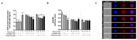 Having established that PPARγ expression in THP-1 macrophages is affected by FICZ treatment, we next assessed whether PPARγ is also important for FICZ-mediated AhR nuclear translocation. Treatment with different concentrations of GW9662 (selective PPARγ inhibitor) prevented AhR translocation induced by FICZ in a dose-dependent manner, with the effect being significant at the highest concentration. This shows that PPARγ activity is crucial for proper translocation of AhR into the nucleus after its activation by an agonist such as FICZ. We also ran a similar experiment utilizing different concentrations of CH223191 (potent AhR inhibitor) to control for optimal inhibitor concentrations to be used in the next experiments, given that CH223191 can be displaced by ligands such as FICZ. The results showed that under the conditions tested, CH223191 is an effective inhibitor of FICZ-induced AhR translocation, as even at low concentrations, the inhibitory effect was observed (Figure 3A). Of note, the previously seen effect of FICZ reducing AhR expression was not abrogated by any inhibitors, neither GW9662 nor CH213191, suggesting that an indirect downstream effect elicited by the presence of FICZ rather than direct activation of AhR is responsible for the downregulation of AhR expression (Figure 3B). These effects can be visually assessed on imaging flow cytometry images (Figure 3C).