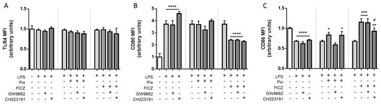 Expression of inflammatory surface markers in THP-1 cells. Macrophage-differentiated THP-1 cells were treated with 100 ng/mL LPS alongside 10 µM pioglitazone (Pio), 10 µM FICZ, 10 µM GW9662, and 10 µM CH223191, either alone or combined, for 24 h. Cells were harvested and stained after treatments. Expression of surface markers TLR4 (A), CD80 (B), and CD86 (C) were assessed by conventional flow cytometry. Data are displayed as normalized MFI values. Results are shown as mean ± standard deviation of the mean (n = 4). Statistical significance was verified by one-way ANOVA followed by Tukey’s post hoc test. * p ≤ 0.05, ** p ≤ 0.01, *** p ≤ 0.001, **** p ≤ 0.0001 in comparison to the untreated control group (first dataset) or the LPS-treated group (second and third datasets). # p ≤ 0.05 in comparison to the LPS-treated group (first dataset) or the Pio/FICZ-treated group (second and third datasets). “+” indicates the respective treatment at the left side of the graph was carried out; “-” indicates it was not. Dotted vertical lines separate datasets. Small horizontal lines group columns together.