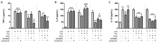 Secretion of proinflammatory cytokines by THP-1 cells. Macrophage-differentiated THP-1 cells were treated with 100 ng/mL LPS alongside 10 µM pioglitazone (Pio), 10 µM FICZ, 10 µM GW9662, and 10 µM CH223191, either alone or combined, for 24 h. Supernatants were collected after treatments. Secretion of cytokines TNF-α (A), IL-6 (B), and IL-10 (C) were assessed by ELISA. Data are displayed as [µg/mL] for TNF-α and [pg/mL] for IL-6 and IL-10. Results are shown as mean ± standard deviation of the mean (n = 4). Statistical significance was verified by one-way ANOVA followed by Tukey’s post hoc test. * p ≤ 0.05, ** p ≤ 0.01, *** p ≤ 0.001, **** p ≤ 0.0001 in comparison to the untreated control group (first dataset) or the LPS-treated group (second and third datasets). # p ≤ 0.05, ## p ≤ 0.01, #### p ≤ 0.0001 in comparison to the LPS-treated group (first dataset) or the Pio/FICZ-treated group (second and third datasets). “+” indicates the respective treatment at the left side of the graph was carried out; “-” indicates it was not. Dotted vertical lines separate datasets. Small horizontal lines group columns together.