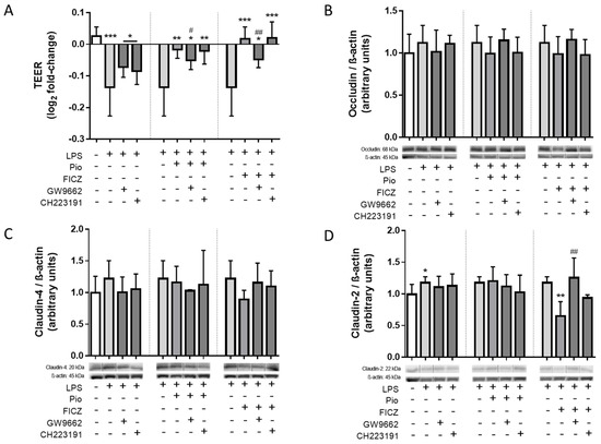 Epithelial integrity and expression of tight junction proteins in Caco-2 cells. Caco-2 cells were placed in a co-culture system alongside macrophage-differentiated THP-1 cells and were treated with 100 ng/mL LPS alongside 10 µM pioglitazone (Pio), 10 µM FICZ, 10 µM GW9662, and 10 µM CH223191, either alone or combined, for 24 h. TEER measurements on the Caco-2 monolayer were performed immediately before and after the treatment period (A). Caco-2 cells were also harvested in RIPA buffer, and the expression of the tight junction proteins occludin (B), claudin-4 (C), and claudin-2 (D) was assessed by Western blotting. For TEER measurements, data are displayed as log2-fold change, and for blots, as normalized arbitrary units measuring the expression ratio of the target protein and housekeeping protein β-actin. Results are shown as mean ± standard deviation of the mean (n = 6). Statistical significance was verified by one-way ANOVA followed by Tukey’s post hoc test. * p ≤ 0.05, ** p ≤ 0.01, *** p ≤ 0.001 in comparison to the untreated control group (first dataset) or the LPS-treated group (second and third datasets). # p ≤ 0.05, ## p ≤ 0.01 in comparison to the LPS-treated group (first dataset) or the Pio/FICZ-treated group (second and third datasets). “+” indicates the respective treatment at the left side of the graph was carried out; “-” indicates it was not. Dotted vertical lines separate datasets. The small horizontal line groups columns together. Lanes within a single blot were rearranged in order to align with the display of experimental groups; thin dotted vertical lines between bands indicate lanes that were spliced together. Original uncropped blots are shown in the Supplementary Materials. kDa = kilodaltons.