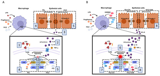 Schematics summarizing the interplay between AhR, PPARγ, and ligands in the “leaky gut” Transwell® co-culture model. Under LPS-elicited inflammatory conditions, TLR4 activation in macrophage-differentiated THP-1 cells (1) leads to a series of downstream effects, namely, increased secretion of cytokines, such as TNF-α, IL-6, and IL-10 (2). These cytokines, especially IL-6, once released in the intercellular milieu, come in contact with the Caco-2 epithelial monolayer and disrupt its integrity by upregulating claudin-2 expression (3). In the presence of the PPARγ-agonist pioglitazone (Pio), all of these effects are attenuated with the exception of increased claudin-2 expression, which nonetheless culminate in reduced inflammatory status in THP-1 macrophages and preserved integrity of the Caco-2 monolayer (4) (left dashed squares). The AhR-agonist FICZ elicits similar effects while also restoring claudin-2 to basal levels (5) (right dashed squares) (A). In the presence of inhibitors, the anti-inflammatory response elicited by the agonists is mostly hampered, but in different ways (6). Blocking AhR with CH223191 (CH) prevents the effect of pioglitazone in attenuating IL-6 secretion by THP-1 macrophages, but as pioglitazone still elicits other PPARγ-mediated effects that do not rely on AhR, monolayer permeability is still restored, albeit not necessarily relying on claudin-2 (7) (left dashed squares). On the other hand, blocking PPARγ with GW9662 (GW) strongly inhibits the actions of FICZ, as it prevents both FICZ-mediated AhR nuclear translocation and also FICZ-mediated effects that do not rely on AhR translocation, which may or may not be AhR-mediated. This leads to increased secretion of IL-6 (and likely of other inflammatory mediators), culminating in increased LPS-mediated claudin-2 expression and subsequent increase in Caco-2 monolayer permeability (8) (right dashed squares) (B).
