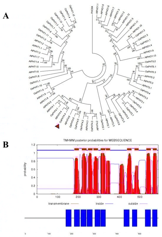 Arabidopsis. A phylogenetic tree was constructed using MEGA software (v7.0.26) with the Jones–Taylor–Thornton (JTT) model employing 1000 bootstrap replications for evolutionary analysis. Transmembrane regions of the OsPHT4;4 protein in rice were predicted using online tools TMHMM and SMART. Expression patterns of