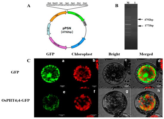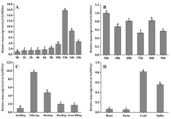 The rice variety used in this study is Oryza sativa L. ssp. japonica cv Nipponbare (BIOGLE GeneTech, Nanjing, China). The plants were cultivated under controlled conditions with a constant temperature of 25 °C, relative humidity of 60%, and a photoperiod of 14 h light followed by 10 h darkness. Each pot initially contained five rice seeds, from which three seedlings were ultimately selected for further growth. Following the development to the two-leaf–one-heart stage in a hydroponic setup, seedlings were transferred to Hogland nutrient solution with varied Pi concentrations. The culture solution was changed every three days. After 21 days of growth, plants were kept in darkness for 3 days before reintroduction to light. Leaf samples were collected at intervals of 0 h, 2 h, 4 h, 6 h, 8 h, 10 h, 12 h, 14 h, and 24 h, respectively, for diurnal rhythm expression. The expression levels of the OsPHT4;4 gene were analyzed at five developmental stages: seedling, tillering, booting, heading, and grain filling. Additionally, OsPHT4;4 expression was assessed in different tissues and organs, including roots, stems, leaves, and spikes, during the heading period.