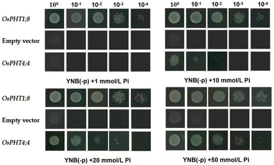 The primers OsPHT1;8F and OsPHT1;8R (see Schedule 1) were used to amplify the target gene OsPHT1;8 from rice RNA as a template, which was subsequently connected, transformed, identified, and sequenced for control purposes. The pYES2 plasmid was enzymatically cut using SacI and XhoI for OsPHT4;4 insertion and HindIII and XbaI for OsPHT1;8 insertion, respectively. The resulting target fragments of OsPHT4;4 and OsPHT1;8 were then inserted into the yeast expression vector pYES2 to construct the yeast expression vectors pYES2–OsPHT4;4 and pYES2–OsPHT1;8 accordingly. These constructed vectors, along with empty-loaded pYES2, were transformed into the yeast mutant strain PAM2 receptor cells for further experiments. Afterwards, positive transformation strains were selected by culturing them in liquid medium until OD600 ≈ 1 was reached. Subsequently, 1 mL of bacterial solution was collected, centrifuged at 6000 rcf for 5 min, washed with 1 mL ddH2O, and again followed by another centrifugation at 6000 rcf for 5 min. To evaluate their performance under Pi-deficient conditions, the diluted bacterial solutions (10-fold serial dilutions: 100, 10−1, 10−2, 10−3, 10−4, 10−5) were applied onto Pi-deficient yeast culture media containing different concentrations of Pi (i.e., 1 mM, 10 mM, 20 mM, and 50 mM). Finally, the cultures were incubated at 30 °C and photographed.