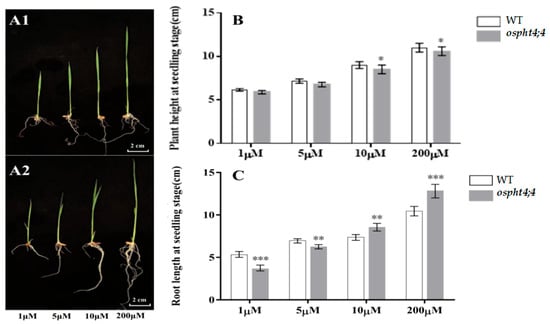 Select wild-type seeds and T2 generation mutant strains of rice OsPHT4;4 with complete phenotypes and consistent sizes and sterilize them with 6% NaClO for 1 h, followed by rinsing with deionized water three times for 5 min each time. After moistening the seeds with water, place them in a constant temperature incubator at 37 °C to accelerate germination. After 24 h, remove the seeds and evenly spread them on a large plate, soaking them in deionized water and covering them with filter paper. Keep the plate in darkness at a temperature of 24 °C in the tissue culture room for two days. Once germinated, sow the seedlings evenly on sterile filter paper placed inside a culture dish and cultivate them using deionized water in a tissue culture chamber. When both ospht4;4 mutants and wild-type rice reach the two-leaf–one-heart stage, transfer them to barrels containing rice nutrient solution under four different Pi concentration gradients (1 μM, 5 μM, 10 μM, and 200 μM) for one week. Capture photographs and measure plant height as well as root length. Rapidly freeze leaves from both ospht4;4 mutant and wild-type rice using liquid nitrogen before storing them at −80 °C.