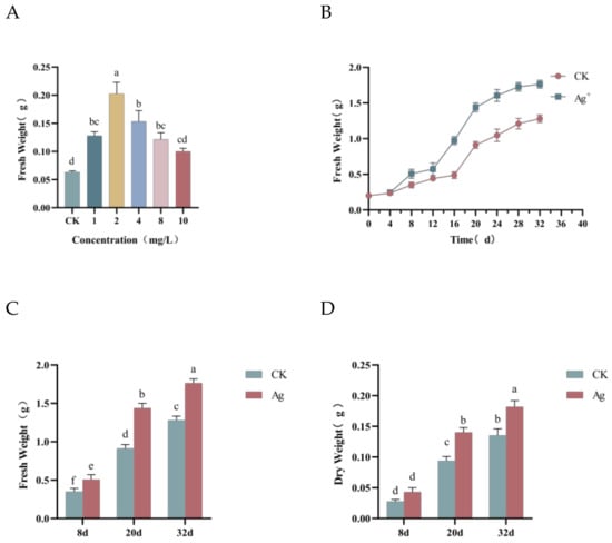 Effect of Pp-AgNPs on the growth of R. glutinosa hairy roots. (A) Different concentration treatments with Pp-AgNPs. (B) Growth curve. (C) Fresh weight of R. glutinosa hairy roots treated with 2 mg/L of Pp-AgNPs. (D) Dry weight of R. glutinosa hairy roots treated with 2 mg/L of Pp-AgNPs. Different letters represent statistical significance (p < 0.05).