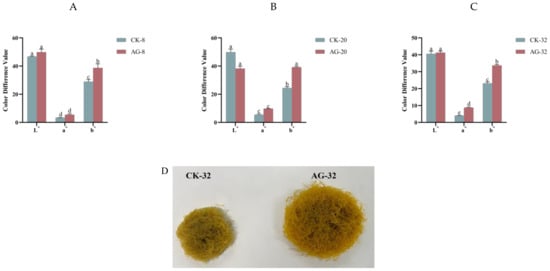 The color changes of hairy roots in the control and treated groups were quantified using a colorimeter (CM-5, Konica Minolta, Tokyo, Japan). The light source was D65, the starting and stopping wavelengths were 350–750 nm, and the standard deviation of ΔE* ab was ≤0.04. Luminance (L*) represents brightness, with a larger L* value indicating greater brightness. (a*) represents red-green phase, with a negative value indicating green and a positive value indicating red. (b*) represents yellow-blue phase, with a negative value indicating blue and a positive value indicating yellow.