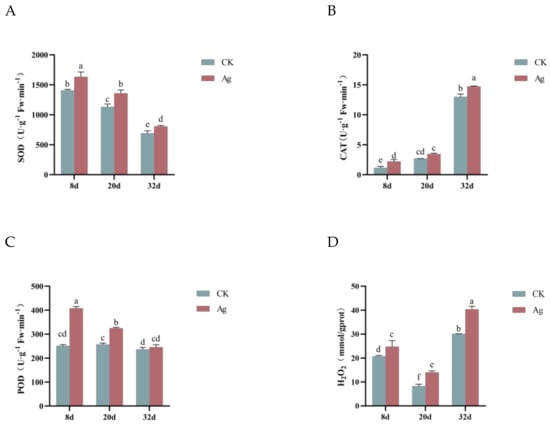 When plants are stressed by AgNPs, they will generate large amounts of reactive oxygen species (ROS), which trigger oxidative stress. As one of the representative molecules of ROS, hydrogen peroxide (H2O2) is also a signal molecule in plants, which plays an important role in response to adversity, disease prevention, and resistance, as well as regulation of growth and development. In the present study, after the treatment with Pp-AgNPs, the H2O2 content in the hairy roots obviously improved at three growth phases. In the early stage (8 d), the H2O2 content of the treatment group was 1.29 times more than that of the control group (Figure 3D). With the extension of the incubation (20 d), the H2O2 content, although decreased, was still higher than the control. At the late period of the growth (32 d), the H2O2 content of the treatment group was the highest (Figure 3D).