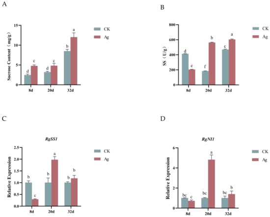 The metabolism of sucrose in the plants is dependent on the catalysis of sucrose synthase (SS) and neutral invertase (NI). In the present study, we found that RgSS activity was significantly lower in the Pp-AgNPs-treated group as compared to the control group at 8 d, whereas RgSS activity was remarkably higher than the control group at 20 d and 32 d (Figure 4B). The trend of the RgSS1 gene expression level was basically the same as that of the RgSS activity, with a significant down-regulation of expression at the early stage of growth (8 d) compared with that of the control group, and a dramatic up-regulation of expression at the rapid-growth stage (20 d) and the late-growth stage (32 d) (Figure 4C,D). NI catalyzes irreversibly hydrolysis of sucrose to fructose and glucose. The expression level of the RgNI1 gene was consistent with that of the RgSS gene, with the highest expression of the RgNI1 gene at 20 d of Pp-AgNPs treatment, which was 1.5-fold of the control.