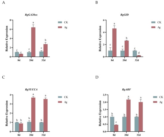 Gibberellin (GA) is an important plant growth-regulating hormone that plays an important role in plant growth and development such as increasing cell elongation, improving biomass, and promoting fruit development. GA20 oxidase (GA20ox) is a key enzyme involved in the GA biosynthesis pathway, catalyzing the conversion of GA12 and GA53 into the active forms GA1 and GA. In Arabidopsis thaliana, the silencing of GA20ox-related genes resulted in dwarfed plants, and growth and development were impaired []. After Pp-AgNPs treatment, the expression of the RgGA20ox gene was not significantly varied between the treated group and the control group in the early growth period (8 d), but was remarkably up-regulated in the rapid-growth period (20 d) and late-growth period (32 d), which were 6.14 and 2.75 times higher than that of the control group, respectively (Figure 5A). The GID protein is a receptor for GA and, together with DELLA proteins, act as major components of the GA signal transduction pathway that promote plant growth by activating the plant’s response to GA. As shown in Figure 5B, the expression of the RgGID gene, in the early-growth and rapid-growth stages, was significantly higher than the control group, while in the late-growth stage, its expression was dramatically lower than the control.
