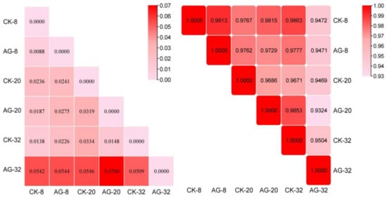 The genetic distances between the six samples treated with Pp-AgNPs and the control were 0.0088–0.07. The larger value of the genetic distance demonstrated the lower genetic similarity between the two samples. The genetic distance between AG-8 and CK-8 was 0.0088, which was the smallest genetic distance between two samples, indicating that the probability of genetic variation between individual samples was small under different treatment conditions.
