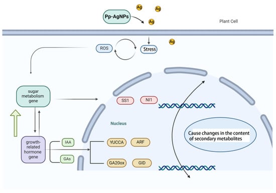 In this study, we investigated the induction effects of Pp-AgNPs in the hairy root culture of the medicinal plant R. glutinosa, and analyzed the mechanism of Pp-AgNPs in facilitating the production of secondary metabolites of R. glutinosa, which provided a basis for the in vitro cultivation, utilization, and promotion of R. glutinosa secondary metabolites. The dry weight, fresh weight, verbascoside, total iridoid glycosides, and total phenylethanol glycoside contents of R. glutinosa hairy roots were all higher in the treated group than in the control group after addition of 2 mg/L Pp-AgNPs for 20 d. Pp-AgNPs were able to prompt the antioxidant enzymes’ activities by inducing the production of ROS in R. glutinosa hairy roots (Figure 7). The growth-promoting effect of Pp-AgNPs may be accomplished by increasing sucrose metabolism, and regulating the synthesis and signal transduction of GA and IAA (Figure 7). Meanwhile, genetic characterization revealed that Pp-AgNPs treatment did not alter the genetic material and stability of hairy roots. In conclusion, the appropriate concentration of Pp-AgNPs can be used as an effective elicitor to improve the biomass and secondary metabolites content in R. glutinosa hairy roots.