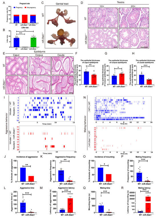 The ablation of miR-29ab1 leads to infertility, which may be due to impaired aggressive and mating behaviors in male mice. (A) Pregnancy rate (n = 10). (B) Litter size (n = 15). (C) Representative images showing the genital tract of reproductive tissues in male mice. (D,E) H&E staining of the testis (D) and epididymis (E). (F–H) The epithelial thickness of the caput (F), corpus (G), and cauda epididymis (H) (n = 10). (I) Raster plots showing the individual aggression of WT and miR-29ab1−/− mice towards an intruder of WT male during the aggressive behavior test (15 min). Blue numerals 1–10 denote that the resident mice are male WT mice, while red numerals 11–20 indicate that the resident mice are male miR-29ab1−/− mice. Each vertical line represents an attack by the resident male mouse on the intruder male mouse (n = 10). (J–M) Quantitative analysis of aggressive animal behavior. Percentage of animals displaying aggressive behavior (n = 10) (J). Frequency of aggressive behavior (n = 10) (K). Amount of time displaying aggressive behavior (n = 10) (L). Latency to aggressive behavior. Each dot represents a mouse (n = 10) (M). (N) Raster plots showing the individual mounting of WT and miR-29ab1−/− mice towards female WT mice during the mating behavior test (15 h). Blue numerals 1–13 denote the male WT mice, while red numerals 14–26 indicate the male miR-29ab1−/− mice. Each vertical line represents a mounting attempt by the male mouse on the female mouse (n = 13). (O–R) Quantitative analysis of mating behavior in animals. Percentage of animals displaying mounting (n = 13) (O). Frequency of mating behavior (n = 13) (P). Time of mating (n = 13) (Q). Latency to mating behavior. Each dot represents a mouse (n = 13) (R). Scale bars, 100 μm; * p < 0.05, ** p < 0.01, *** p < 0.001, n.s., not significant.