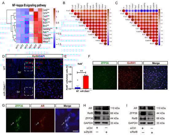 Zfp36 targets RelB to inhibit AR expression. (A) Heatmap of 11 genes activated in the NF-κB signaling pathway. (B) Correlation analysis of Zfp36 and 11 genes involved in the NF-κB signaling pathway. (C) Correlation analysis of Ar and 11 genes involved in the NF-κB signaling pathway. (D) Representative immunofluorescence images showing RelB staining in the hypothalamus of WT and miR-29ab1−/− mice. Scale bar, 20 μm. (E) The number of RelB+ cells in the hypothalamus of WT and miR-29ab1−/− mice. Each dot represents a sample (n = 6). (F) Representative images showing the costaining of ZFP36 and GnRH1 in the hypothalamus. Scale bar, 20 μm. (G) Representative images showing costaining of ZFP36 and AR in GT1-7 cells. White arrows indicate co-localized cells. Scale bar, 20 μm. (H,I) Representative images of western blot showing AR, RelB, and ZFP36 protein expression after treatment of GT1-7 cells with siZfp36 (H) or siRelB (I) for 48 h. siControl samples received scrambled siRNA (siCtrl); 3V, third ventricle; ZFP36, zinc finger protein 36; GnRH1, gonadotropin-releasing hormone 1; AR, androgen receptor; DAPI, 4′6-diamidino-2-phenylindole. * p < 0.05, ** p < 0.01, *** p < 0.001.