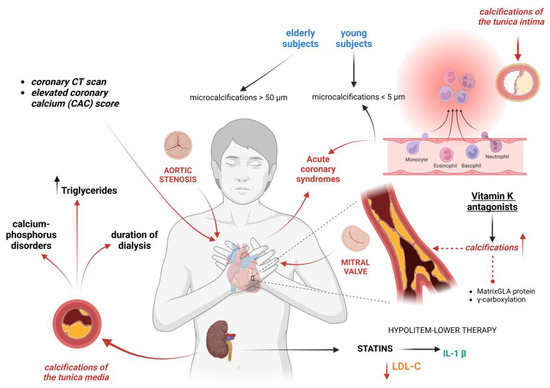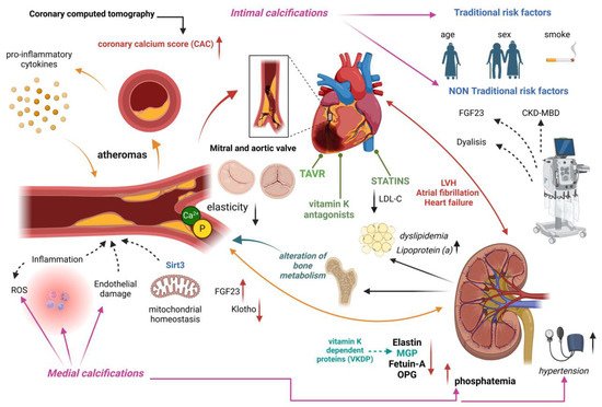 The onset of cardiovascular disease (CVD) is common in patients with CKD. Individuals with CKD have a significant increased risk of cardiovascular events: 50% of patients with stage 4/5 CKD develop CVD. Moreover, cardiovascular mortality in advanced forms of renal failure accounts for about 40–50% of all deaths [123]. Coronary artery disease (CAD) is linked to both traditional and non-traditional CVD risk factors, as well as dialysis-related factors; additionally, vascular calcifications (VC) rise with decreasing glomerular filtration rate (GFR) and are linked to mortality in end-stage kidney disease [124,125,126].
