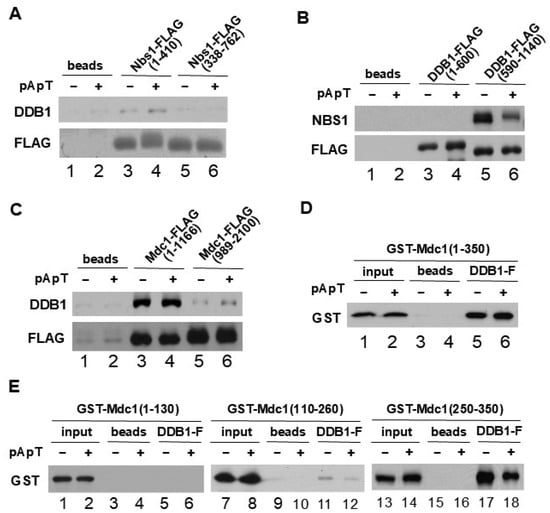 To identify the specific region of MDC1 that interacts with DDB1, we conducted structure-function analyses to clarify which parts of MDC1 are involved in this binding. The N-terminal portion of MDC1 houses a single forkhead-associated (FHA) domain, while the C-terminal region contains two BRCT domains [,]. We generated tagged fragments of MDC1 covering the N-terminal (residues 1–1166) and C-terminal (residues 989–2100) sections of the protein and performed pull-down assays using anti-FLAG antibody beads with or without pA-pT. These fragments were incubated with the beads in egg extracts, and after isolating the tagged proteins, we found that DDB1 bound to the N-terminal fragment but not to the C-terminal fragment of MDC1 (Figure 4C). In previous research, we established that both NBS1 and TopBP1 bind to the N-terminal portion of MDC1 []. To further refine our understanding of the regions essential for DDB1 binding, we created various deletions within the N-terminal domain of MDC1. A GST-tagged fragment corresponding to residues 1–350 of MDC1 demonstrated the ability to bind to DDB1 in egg extracts (Figure 4D). To investigate which region of DDB1 interacts with MDC1, we constructed GST-MDC1(1–130), GST-MDC1(110–260), and GST-MDC1(250–350) fragments and incubated them in egg extracts with recombinant DDB1-FLAG on anti-FLAG antibody beads, both in the presence and absence of pA-pT. Following the isolation of the beads, we performed immunoblotting for GST. We detected the binding of the GST-MDC1(250–350) fragment to DDB1-FLAG beads (Figure 4E). These findings suggest that residues 250–350 of MDC1 are critical for interacting with DDB1. Our earlier studies showed that residues 490–600 of MDC1 are involved in binding with NBS1 in egg extracts [], specifically through the SDT repeats located in that region [,,,]. Furthermore, MDC1 is known to associate with the tandem BRCT repeats of NBS1 []. Overall, these results support the conclusion that MDC1 serves as a connector between DDB1 and NBS1 (Figure 5E).