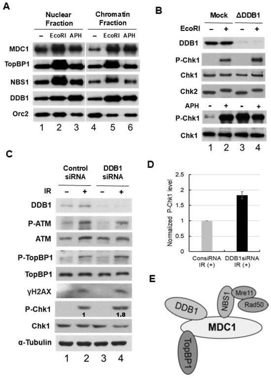 Given that DDB1 engages with several NBS1-associated proteins involved in DNA damage responses, we investigated whether DDB1 binds to damaged chromatin. To explore this, we incubated Xenopus sperm chromatin in egg extracts with or without EcoRI to induce double-stranded breaks. We also treated the extracts with aphidicolin to cause stalled DNA replication forks. Afterward, we prepared nuclear and chromatin fractions to analyze the levels of DDB1 and other interacting checkpoint proteins such as MDC1, TopBP1, NBS1, and Orc2 (Figure 5A). Our observations indicated that DDB1 exhibited greater association with chromatin damaged by EcoRI and aphidicolin compared to undamaged chromatin (Figure 5A). Similar increased binding was noted for MDC1, TopBP1, and NBS1 in the presence of both EcoRI and aphidicolin, consistent with previous findings. Overall, these findings suggest that DDB1 forms a complex with other interacting proteins, and this complex shows significantly enhanced binding to damaged chromatin (Figure 5A,E).