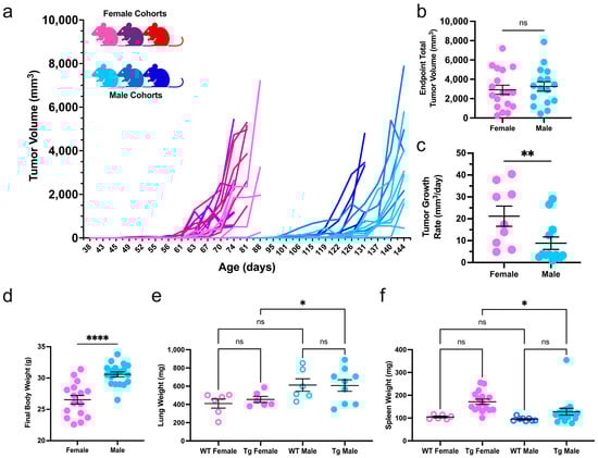 Disease kinetics in female and male mammary carcinoma. (a) Caliper measurements of total tumor burden for three cohorts of transgenic female (shades of pink) and male (shades of blue) MMTV-PyMT mice; (b) total tumor volume at the study endpoint (females = 18, males = 16) and (c) the growth rate of the first palpable tumor of each mouse were compared between the sexes (females = 9, males = 12); (d) the final body, lung, and spleen weights of MMTV-PyMT (Tg) mice compared to non-transgenic littermates (WT); (e) spleen and (f) lung weights in non-tumor- and tumor-bearing female and male cohorts. All metrics were compared with a Student’s t-test or two-way ANOVA where applicable. * p ≤ 0.05, ** p ≤ 0.01, **** p ≤ 0.0001, and ns = nonsignificant.