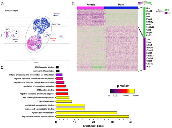 Next, single-cell RNA sequencing (scRNAseq) was performed on whole tumor samples to determine the gene expression profile of tumors from each sex. Tumor cells were confirmed through the expression of various epithelial-specific transcripts such as cytokeratin and E-cadherin and the lack of immune and stroma-related genes. Female and male tumor samples had considerable heterogeneity (Figure 2a,b). Differential analysis of tumors demonstrated that male tumors had greater transcript expression of cell cycle regulators p21 and Ccnd2, and the antiapoptotic gene Bax. These genes contributed to the overall enrichment of gene sets associated with the positive regulation of cell growth observed in male tumors. Genes previously linked to metastasis, Bcl2, and Notch were downregulated in male samples compared to females; however, broad pathways involved in cell migration mediation, such as the advanced glycation end products (AGE), S100 binding proteins, and their cognate receptor (RAGE) signaling cascades (Figure 2c and Figure S1e) were enriched. These data highlight a complex gene regulatory network based on sex and likely support sex differences in mammary tumor development and spread.