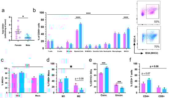 Cd11b+ myeloid cells were in higher proportions in male tumors, and the myeloid lineage cell types M-MDSC, DC, neutrophil, and macrophage showed no differences between the sexes. Moreover, MHC2-expressing cells were elevated in the immune compartment of male tumors (Figure 3b). Macrophages and dendritic cells (DC) are antigen-presenting cells (APCs) that upregulate MHC2 upon successful activation [,]. In males, the overall increase in MHC2+ cells was supported by a greater percentage of MHC2+ in these two APC populations (Figure 3c). Another indicator of macrophage function is the presence of the CD206 surface marker, also known as the mannose receptor [], which is expressed on tumor-promoting M2-like macrophages. Intratumoral percentages of tumor-suppressing M1-like macrophages (Cd11b+, CD206-) were elevated in male mice, while M2-like (Cd11b+, CD206+) macrophages were increased in females (Figure 3d). In addition, DCs exhibit antitumor phenotypes through conventional activation and the sustained expression of myeloid cell marker Cd11b. Conversely, Cd11b-negative DCs are shown to have unconventional activation and support tumor growth []. Male tumors had increased conventional and decreased unconventional DCs compared to tumors from female mice (Figure 3e). Lastly, mammary tumors displayed modest, albeit nonsignificant, sex-associated differences in the ratios of T-helper (CD4+) and cytotoxic (CD8+) T-lymphocyte subsets (Figure 3f).