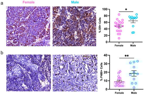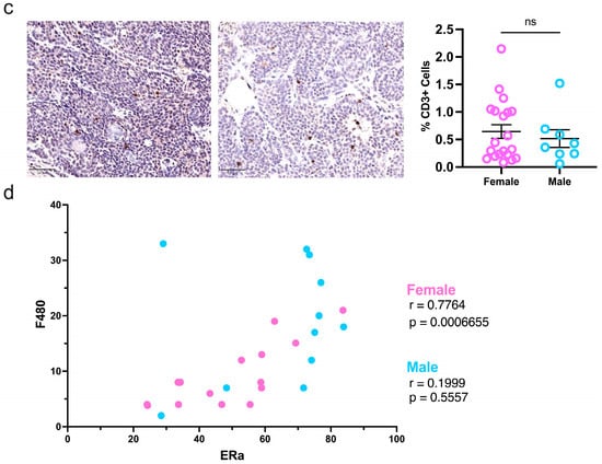 Finally, due to increased hormonal signaling in male tumors reported by the scRNAseq data, immunohistochemistry was used to evaluate ERα protein expression in sex-specific MMTV-PYMT tumors. In male mice, more tumor cells (65%) were positive for ERα compared to female tumors (48%; Figure 4a). Immune cell infiltration and activation are important for regulating cancer progression. However, the immune profile of luminal cancers, especially in males, is poorly understood []. To study the immune compartment, consecutive tumor sections were stained for F480+ macrophages and CD3+ T-cells. Aligned with the flow cytometry data, macrophages were highly represented in mammary tumors of both sexes. Male tumors demonstrated increased macrophage infiltration compared to females, and no sex differences were reflected in the presence of T-cells (Figure 4b,c). Moreover, female but not male tumors had a positive correlation between macrophage infiltration and ERα expression (Figure 4d). Estrogen is shown to recruit tumor-associated macrophages []. However, these data suggest the estrogen receptor status of mammary tumors significantly influences the immune response of females and is less important in males despite its increased presence in male tumors. Taken together, these data support a divergence of intratumoral immune regulation and activation between female and male tumor-bearing MMTV-PyMT mice.