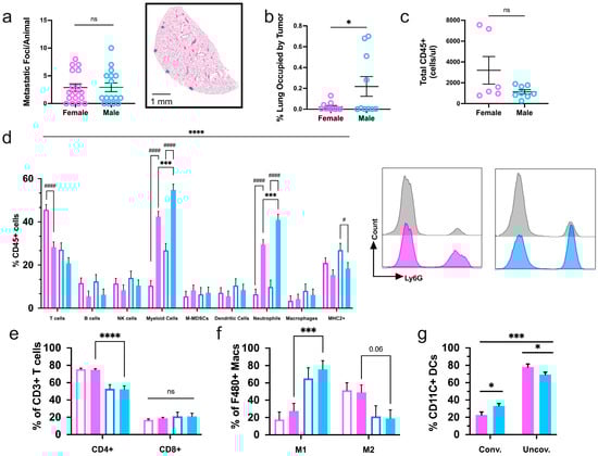 Mammary carcinoma progression induces sex-specific immune profiles in the whole lungs of PyMT mice. (a) The sum of metastatic foci from three planes of lung tissue harvested from tumor-bearing MMTV-PyMT female and male mice. An H&E image of a plane of lung tissue with four visible metastatic foci (right); (b) the area of metastatic foci compared to the total lung area. (c) Quantification of total immune cells (CD45+) and (d) the proportions of subpopulations were analyzed by flow cytometry in lungs from tumor-bearing female tumor-bearing female (pink) and male (blue) MMTV-PyMT mice. Transgenic mice (solid bars) were assessed alongside sex- and age-matched non-transgenic littermates (unfilled bars). Neutrophils (CD45+, Ly6G+) proportions from transgenic female (pink) and male (blue) mice and sex- and age-matched non-transgenic littermates (grey) are represented by histograms (right); (e) subsets of T-cells, (f) macrophages, and (g) dendritic cell populations. Graphs depict the pooled data from two cohorts of transgenic and non-transgenic female and male mice (n ≥ 6). * or # p ≤ 0.05, *** p ≤ 0.001, **** or #### p ≤ 0.0001 and ns = nonsignificant.