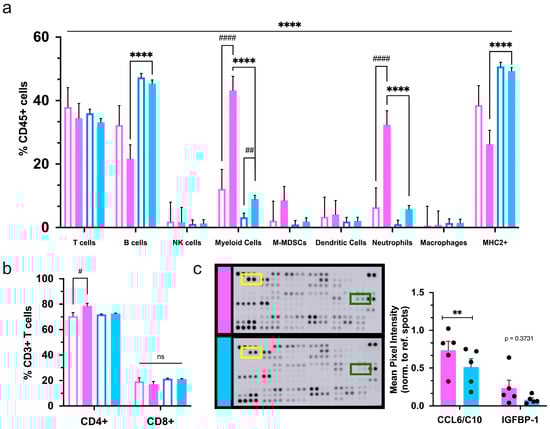Systemic immune composition and signaling varies based on mammary tumor presence and sex. (a) The frequency of immune populations was analyzed by flow cytometry in the spleens of non-transgenic (unfilled bars) and tumor-bearing transgenic (solid bars) female (pink) and male (blue) mice; (b) assessment of T-cell subsets in mouse spleens. Graphs depict the pooled data from three separate cohorts of transgenic and non-transgenic female and male mice (n ≥ 16); (c) immune-related proteins were quantified from the plasma of transgenic mice at the end of the study. Shown are representative immunoblots of multiprotein array from transgenic mice of each sex (left) with quantitation of changes on the right, (n = 5 per sex). The yellow and green boxes on the blots highlight CCL6 and IGFBP-1, respectively. Significance was determined by two-way ANOVA. # p ≤ 0.05, ** or ## p ≤ 0.01, **** or #### p ≤ 0.0001 and ns = nonsignificant.
