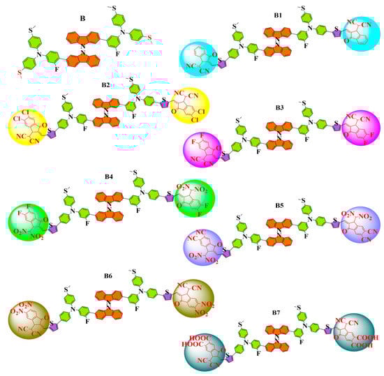 19], which has donor branches and bicarbazole as its central core. While maintaining the integrity of the other side of the reference, we end-cap engineered one of the sides of reference B, while maintaining the central core unchanged. A modification was made to reference B by adding new side chain groupings.