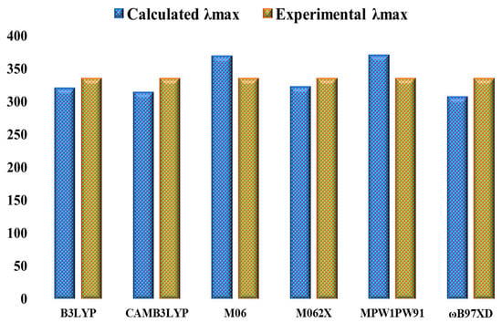 max values were 320.02 nm, 313.74 nm, 370.72 nm, 307.20 nm, 368.82 nm and 322.31 nm, respectively. Nonetheless, the value of B that was determined experimentally was 335 nm, indicating a direct correlation to the theoretically estimated value of 322.31 nm at 6–31G (d,p)/M062X. Therefore, for the further computational investigation of the suggested molecules, the basis set 6–31G (d,p) and the DFT functional M062X were selected.