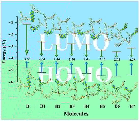 The electron density of the HOMO in the reference molecule (B) is dispersed greatly over the donor portion of the molecule, with a slightly lower concentration on the core groups. On the other hand, the electron density is mainly concentrated on the acceptor moiety in the LUMO, although some electron density is also linked to the donor groups. The electron density of LUMO also lies in the π-bridge portion of all designed molecules B1–B7. From the discussion above, it is clear that in all of the newly proposed compounds (B1–B7), the acceptor unit’s attachment to the reference molecule significantly increases the donor units’ ability to donate electrons to the acceptor segment via a bridge, making them excellent candidates for better solar cell devices.