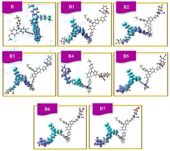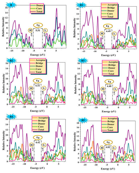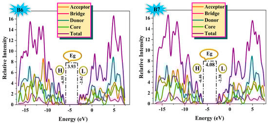 24]. For DOS interpretation, each designed structure is split into four segments: the core, the donor, the bridge, and the acceptor. PyMolyze 1.1 software analyzes the outcomes of the DOS analysis. The acceptor’s contributions are as follows: for B1–B7, they are 2.7%, 2.4%, 2.5%, 1.8%, 2.2%, 2.1%, and 2.2% to HOMO and 58.8%, 63.8%, 60.7%, 63.1%, 75.5%, 78.6%, and 71.4% to LUMO, respectively. Similar to this, the donor provides 88.9%, 90.0%, 89.7%, 83.0%, 90.9%, 91.3%, and 91.1% to HOMO and 10.4%, 8.3%, 9.3%, 8.5%, 5.2%, 4.4%, and 6.1% to LUMO for B1–B7. Reference molecule B has two segments: core and donor. Donor provides a contribution of 99.8% to HOMO and 20.8% to LUMO. Core provides a contribution of 0.2% to HOMO and 73.2% to LUMO.