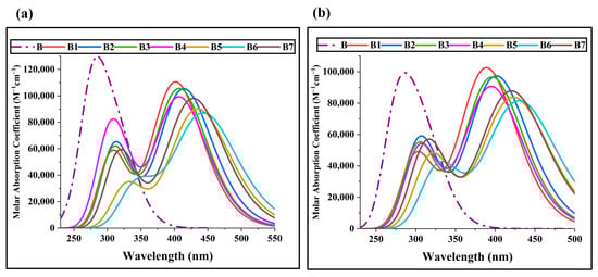 max range of 402.72–444.93 nm. In the solvent phase, B6 and B4 molecules have the largest λ