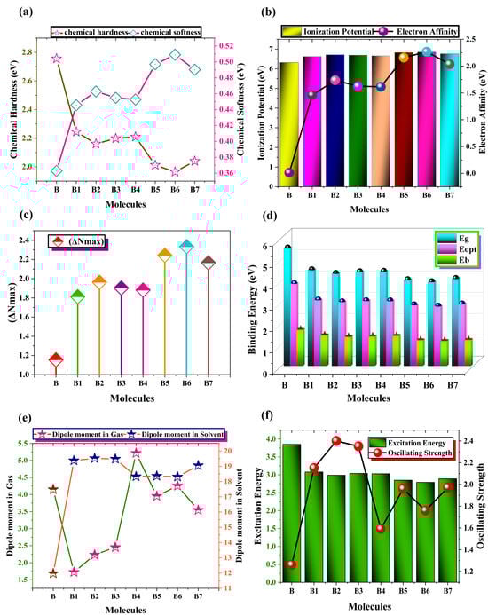 Table 4 contain a tabulation of the optical characteristics of B and B1–B7 that were studied in both the gaseous and solvent media. All of the compounds’ maximal absorption in the gas and liquid phases is shown in