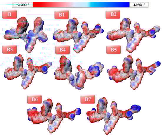 Table 12. The HDI values are B (3.62), B1 (5.51), B2 (5.82), B3 (6.23), B4 (4.39), B5 (6.12), B6 (4.36), and B7 (6.32). The EDI values are B (3.49), B1 (3.59), B2 (3.57), B3 (3.71), B4 (4.38), B5 (5.20), B6 (4.80), and B7 (4.60). Electron delocalization is measured by the D index, often known as the delocalization index. The H index (hole delocalization index) measures how a hole in a molecule delocalizes. As shown in