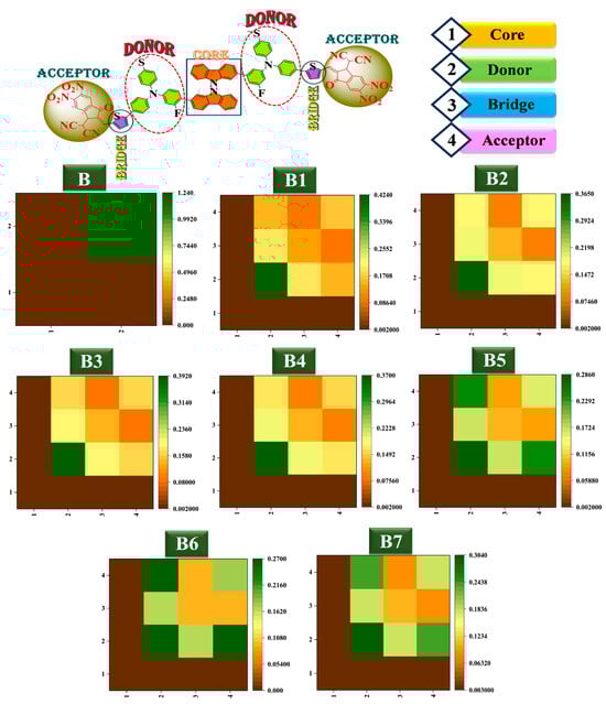 Using the Multiwfn program, we examined electronic structures and produced electron density difference (EDD) maps for designed HTMs B1–B7 and reference B to comprehend how electronic excitation leads to charge separation. The obtained EDD maps for the targeted HTMs B and (B1–B7) are displayed in