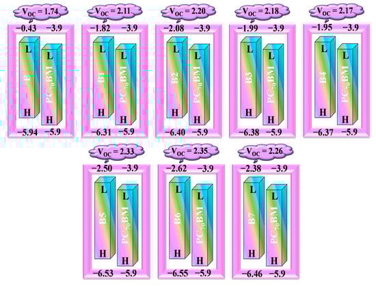 70BM acceptor polymer, is used to calculate the Voc by virtue of its precedent performance in assisting in charge transfer from the donor to the acceptor. Scharber’s Equation is used to calculate the Voc of the reference compound (B) and its intended derivatives (B1–B7) [