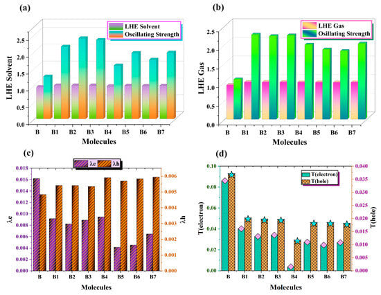 Table 13 illustrates that B6 has lower reorganizational electron and hole mobility values than the compounds that were previously created (B1–B7). As seen in
