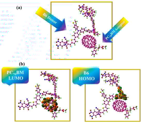 70BM) entity, whereas HOMO density is located on top of the B6 donor component of the produced compound. The charge density between the two molecules (B6:PC