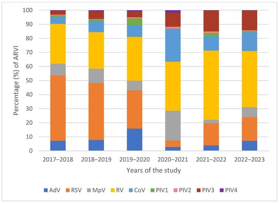 The percentage distribution of acute respiratory viral infections between 2017 and 2023. AdV—adenovirus, RSV—respiratory syncytial virus, MpV—metapneumovirus, RV—rhinovirus, CoV—seasonal coronavirus, PIV1—parainfluenza virus type 1, PIV2—parainfluenza virus type 2, PIV3—parainfluenza virus type 3, PIV4—parainfluenza virus type 4.