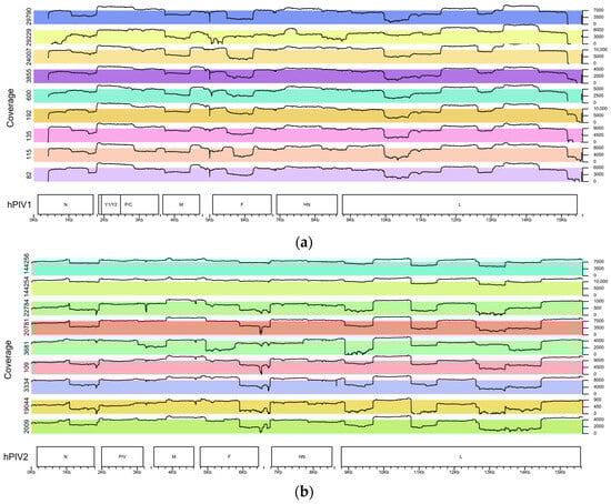 Coverage plots of hPIV genomes generated using the VizCoV script in the RStudio environment (https://github.com/LMV-NIC-St-Petersburg/VizCoV, accessed on 1 December 2024): (a) coverage plot representing nine hPIV1 samples after sequencing; (b) coverage plot representing nine hPIV2 samples after sequencing.