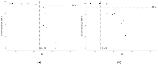 Scatterplots of assessing the primer panels sensitivity of hPIV1 and hPIV2 isolates’ dilution series by assessing sequencing parameters in relation to Ct values: (a,b) scatterplots of minimum coverage at 20× depth vs. Ct values for hPIV1 and hPIV2, respectively.