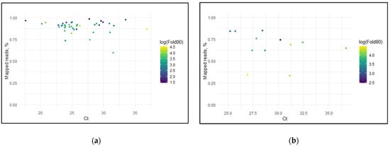 The performance of the developed panels was assessed by examining the following metrics: the percentage of reads mapped, the percentage of the genome covered at a minimum depth of 20× (% min 20×), and the Fold80 penalty as a metric of coverage uniformity, all in relation to the cycle threshold (Ct) values. The scatterplot of hPIV1 demonstrated a correlation between Ct values and percentage mapped of sequencing reads (Figure 5a). For samples with lower Ct values, the percentage mapped was consistently high, with most samples manifesting close to 100% of reads successfully aligned to the reference genome. However, whilst Ct values increased, we observe a reduction in mapping efficiency of samples, with the percentage of mapped reads dropping to around 75% for some samples. Furthermore, a similar trend was noticed for hPIV2 (Figure 5b), where samples with Ct values below 28 exhibited high mapping percentages (over 75%). However, for certain samples with Ct values greater than 31, the percentage of mapped reads drops to 50%, which confirms the direct Ct-values-mapped reads relation. Strikingly, two samples with similar Ct values (around 31) revealed a considerable difference in mapping efficiency, which may be explained by the variability in the quality of clinical samples and technical factors that could affect the performance.