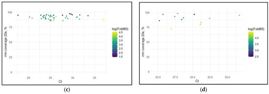 Scatterplots of the primer panels efficiency used for whole-genome sequencing of hPIV1 and hPIV2 by assessing sequencing parameters in relation to Ct values: (a,b) scatterplots of percentage mapped vs. Ct values for hPIV1 and hPIV2, respectively; (c,d) scatterplots of percentage min 20× vs. Ct values for hPIV1 and hPIV2, respectively. The color gradient represents the log(Fold80) value.