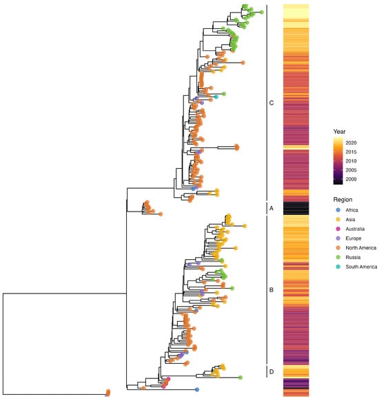 For hPIV1, the whole-genome-based ML phylogenetic tree revealed four clades (A–D), with Russian strains distributed across clades B, C, and D. Most Russian sequences were clustered within clade C, while nine were grouped in clade B, and a single strain (PP757765) in clade D clustered alongside strains previously reported in China [].